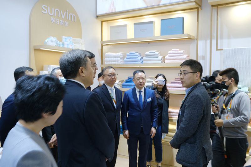 近日,2023中國國際家用紡織品及輔料(春夏)博覽會在上海國家會展中心隆重舉行。孚日集團旗下孚日家紡和潔玉毛巾兩大品牌在此次展會精彩綻放,孚日集團副總經理國內品牌運營總負責人孫浩博帶隊參展。展會首日,商務部市場建設司司長周強、工業和信息化部消費品工業司司長何亞瓊、供銷合作總社農業生產資料與棉麻局副局長王建紅、中國紡織工業聯合會會長孫瑞哲、中國紡織工業聯合會副會長、中國家用紡織品行業協會監事長楊兆華、中國紡織工業聯合會秘書長夏令敏等領導及嘉賓一行到孚日展館參觀,深入了解企業的運營狀況、科研優勢、技術創新等信息。